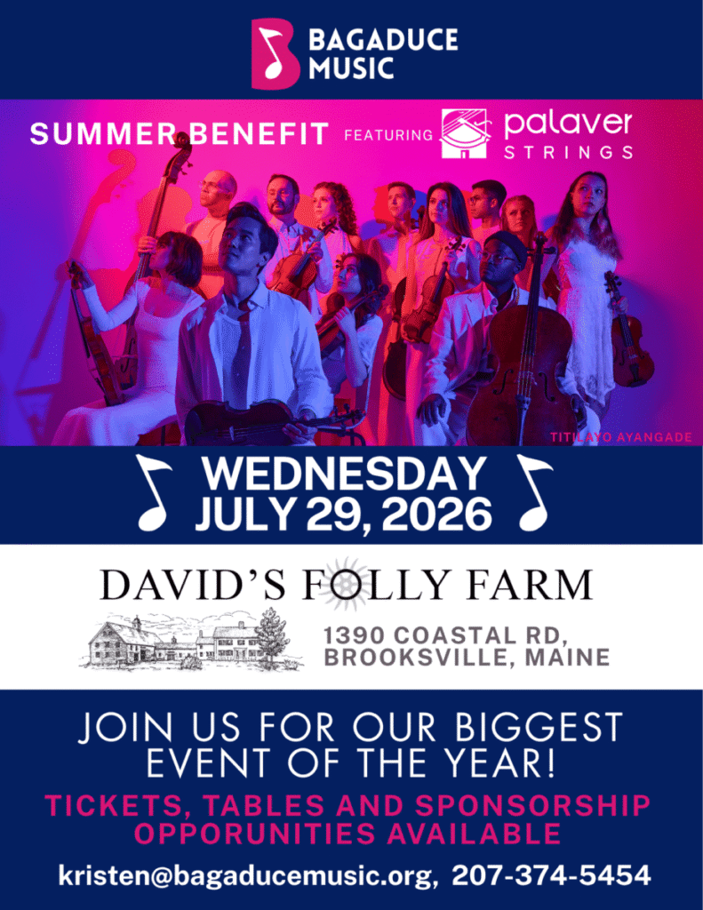 Wednesday, July 29th. BAGADUCE MUSIC BENEFIT featuring Palaver Strings.