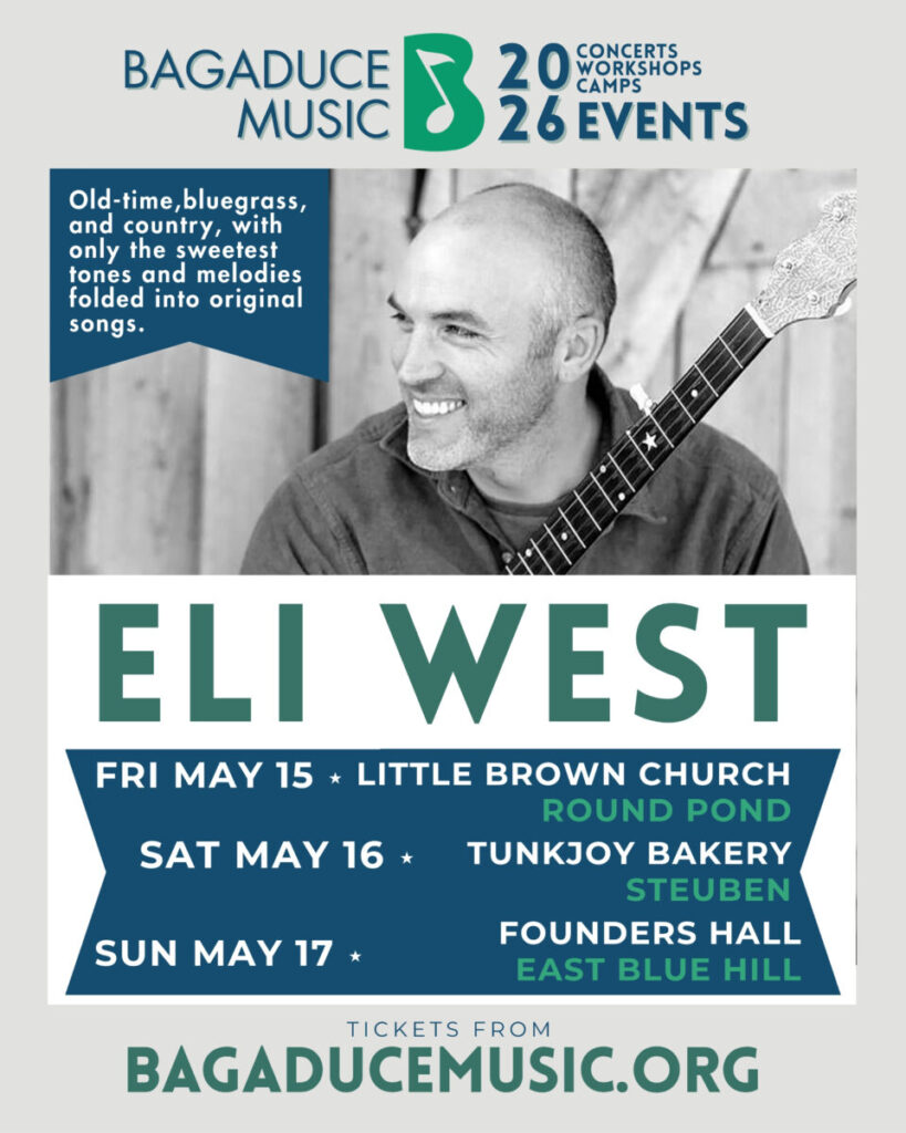Eli West to Perform Three Concerts, Lead Instrumental + Songsmith Workshop in Coastal Maine TICKET LINK American roots musician Eli West will bring his distinctive blend of old-time, bluegrass, and country music to coastal Maine for three concerts and a workshop May 15–17, presented by Bagaduce Music.